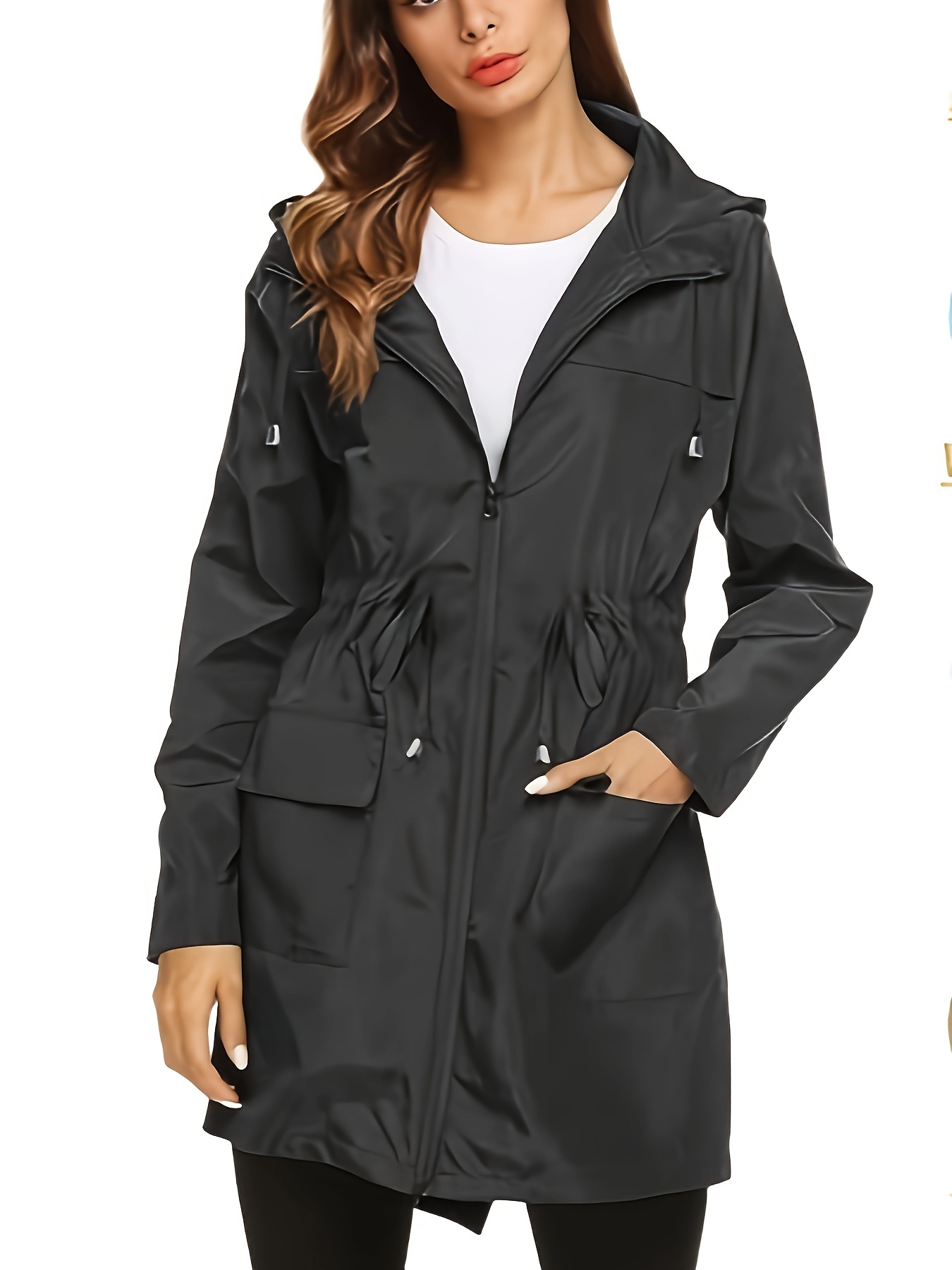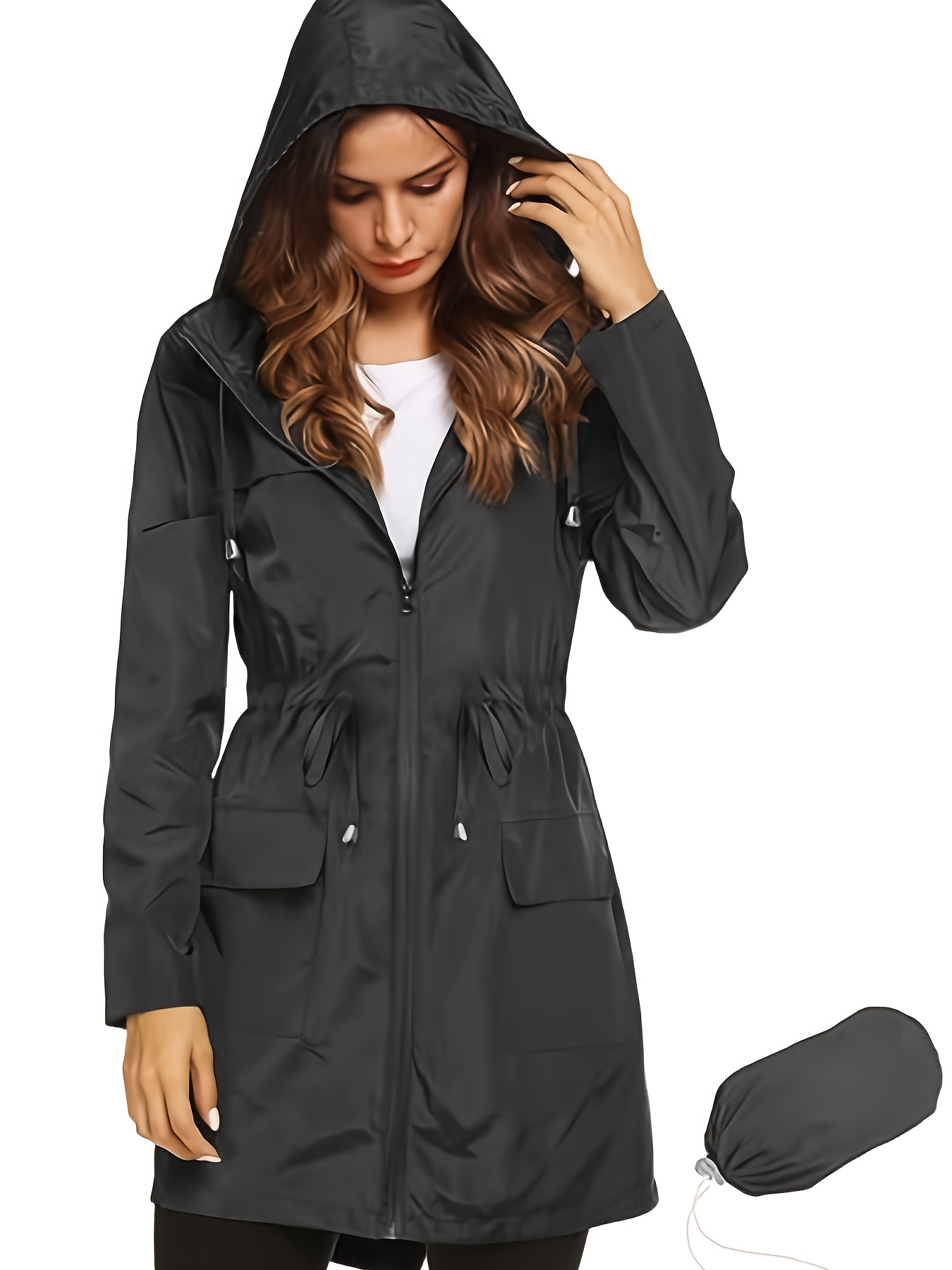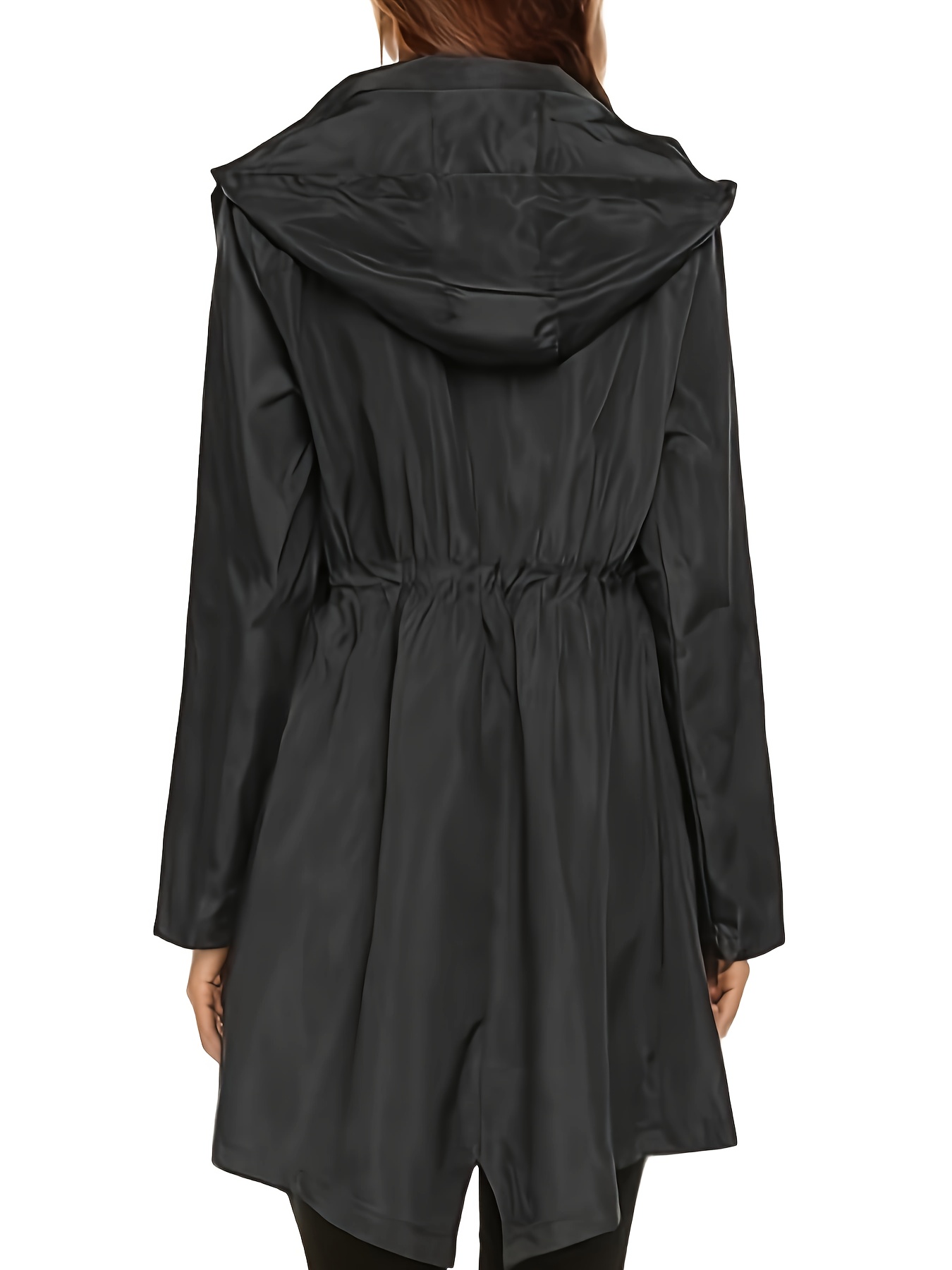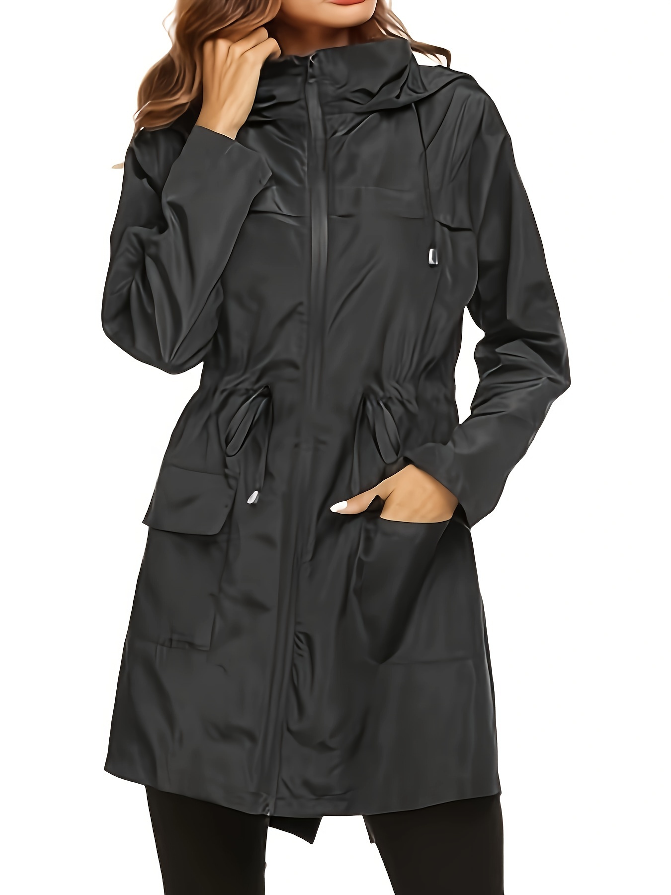 1pc Women's Plus Size Casual Hooded Drawstring Long Coat Jacket, Polyester Solid Color Regular Sleeve Open Front Split Hem Trench for All Seasons