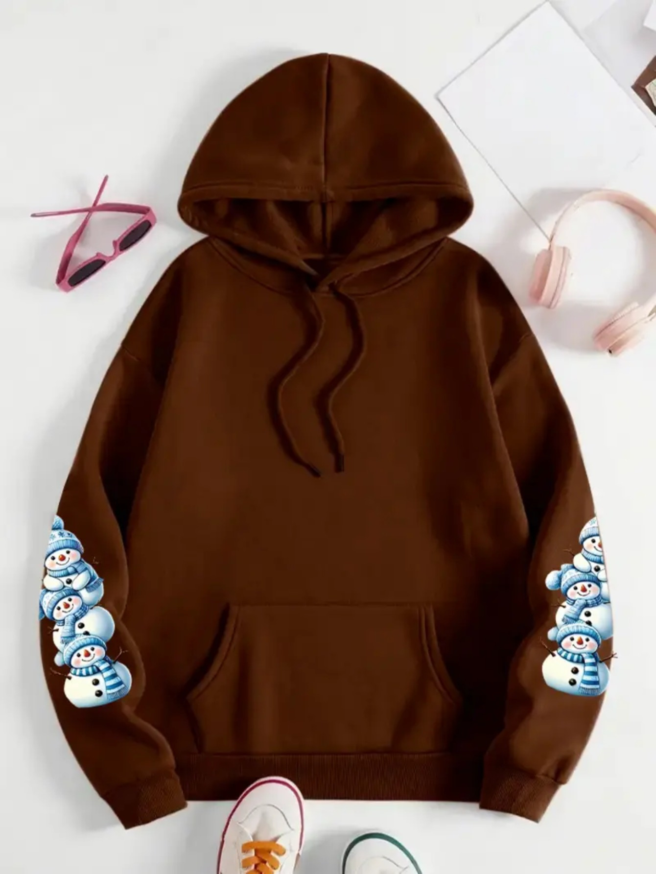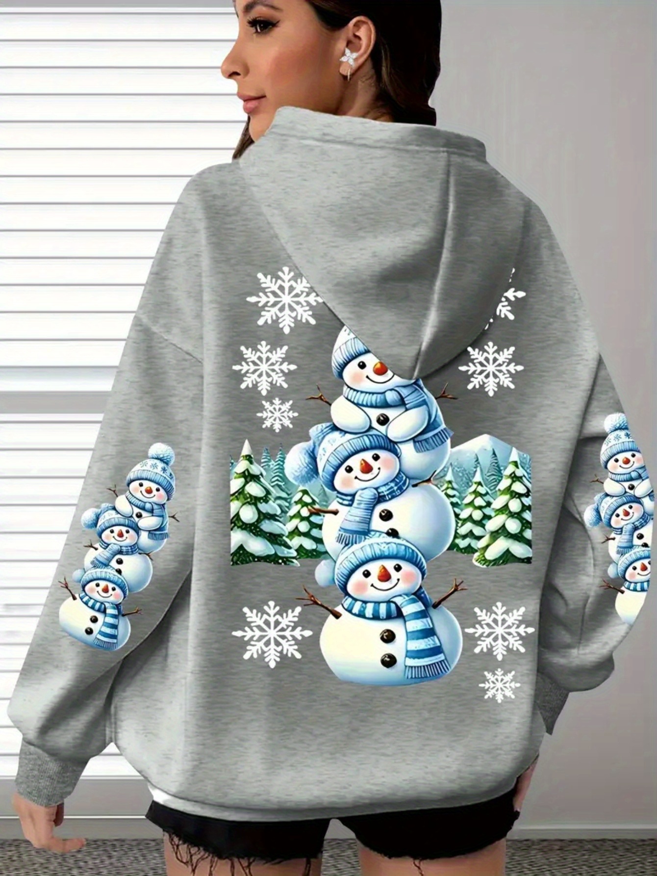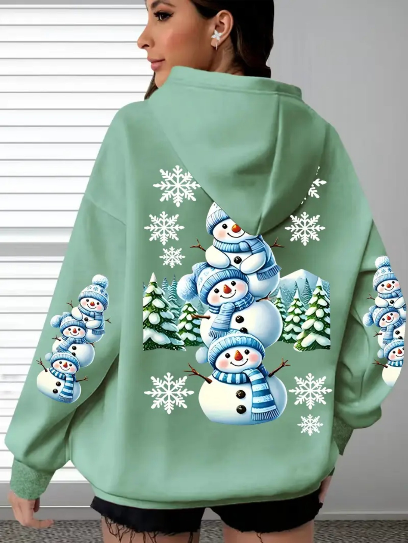 [Cozy Snowman Hoodie] Cozy Oversized Women's Mint Green Snowman & Snowflake Print Hoodie | Soft Casual Long Sleeve Pullover with Pockets, Machine Washable, Winter Accessories, Comfortable Clothing, Playful Graphic Design, Durable Fabric