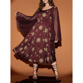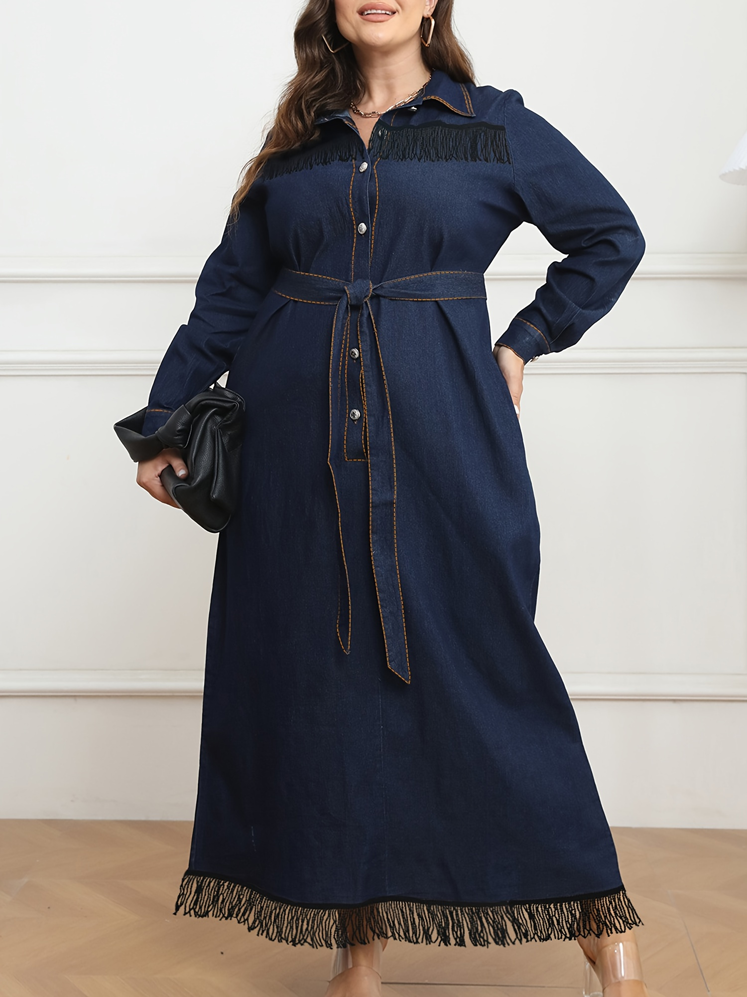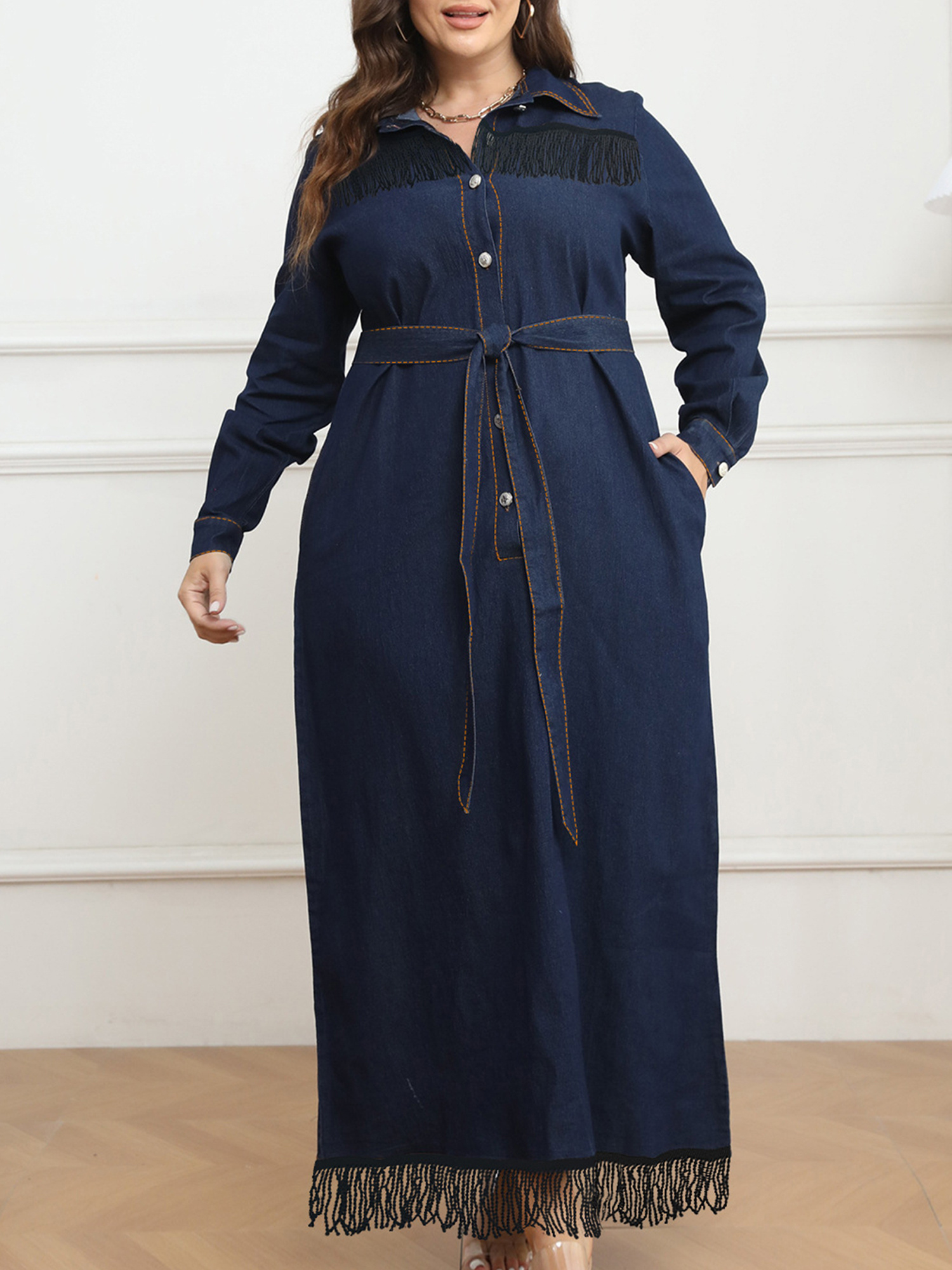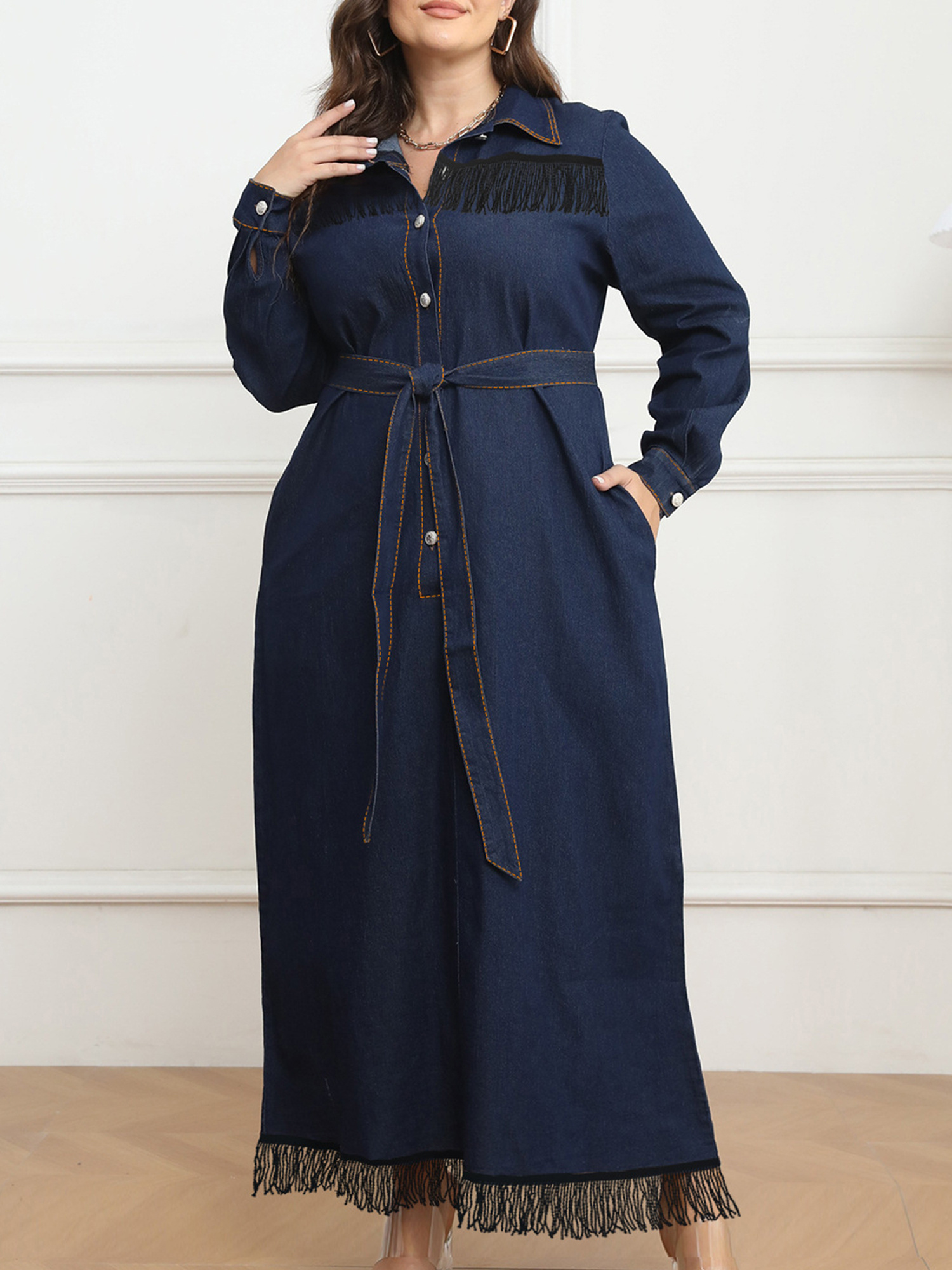 Plus Size Casual Long Sleeve Tunic Dress, Cotton Blend, Slight Stretch, Solid Color, Loose Fit, with Lapel Collar, Tassel Detail, for Fall/Winter