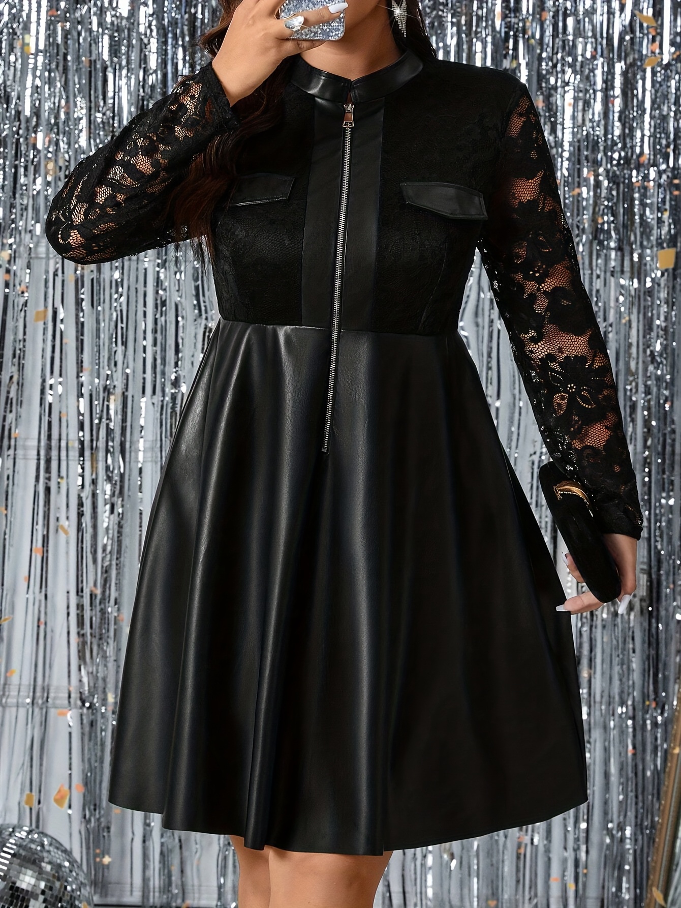 Plus Size - Women'S Elegant Black Lace Long Sleeve Dress with Contrast Lace Detail - Loose Fit, Stand Collar, Regular Sleeve, Mid-Length, All-Season Casual to Semi-Formal Wear
