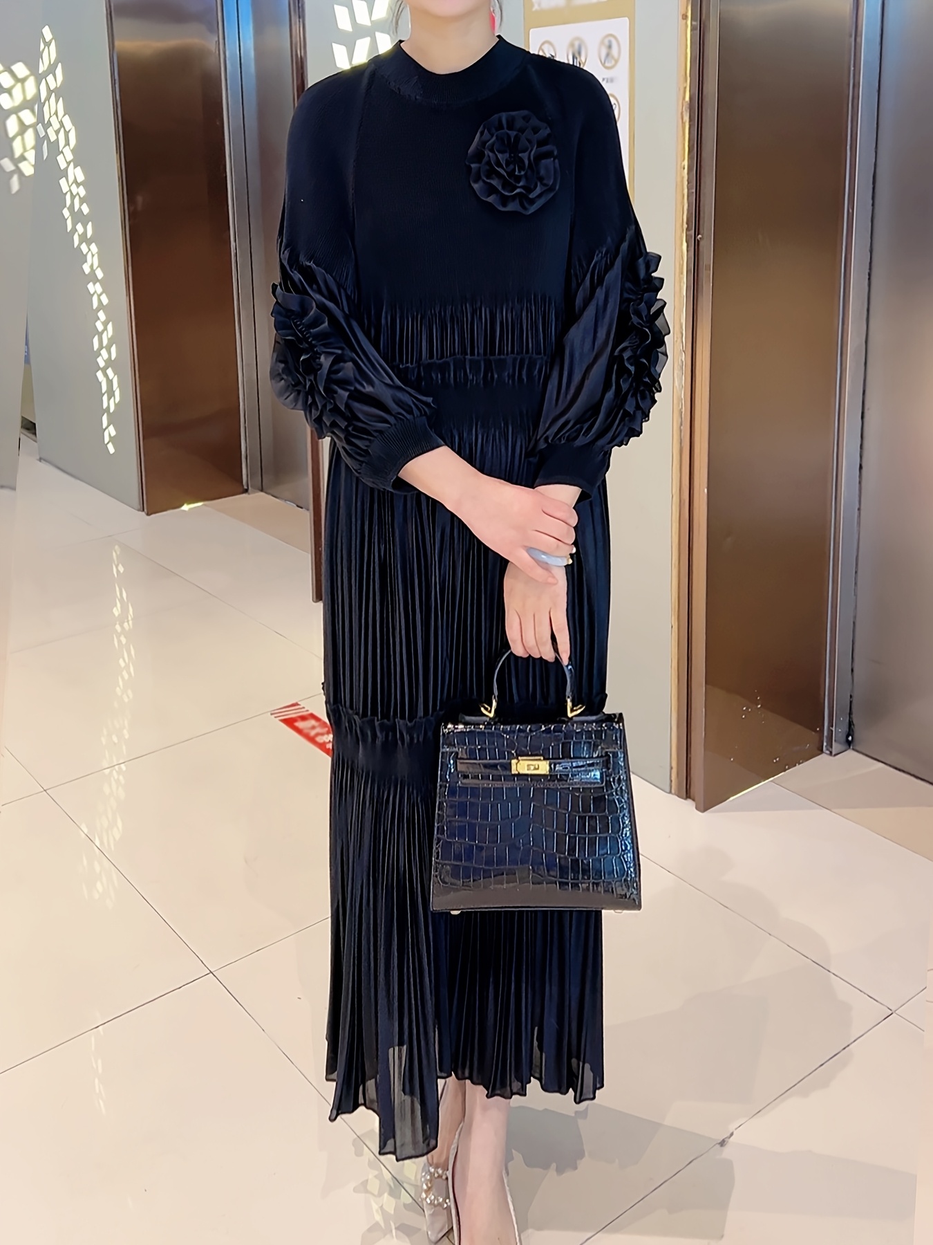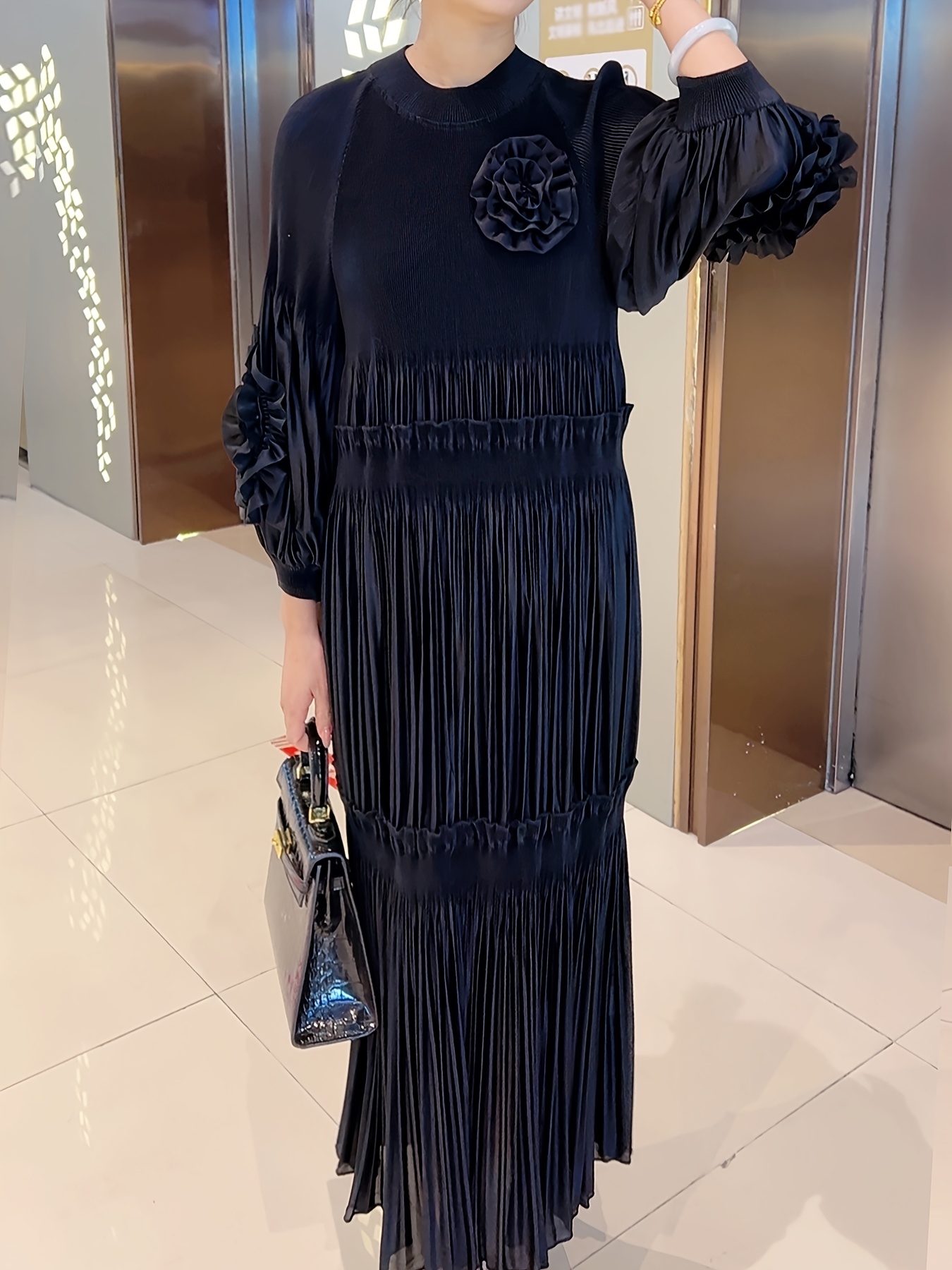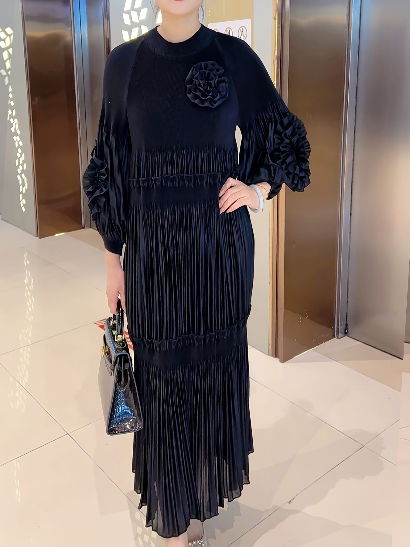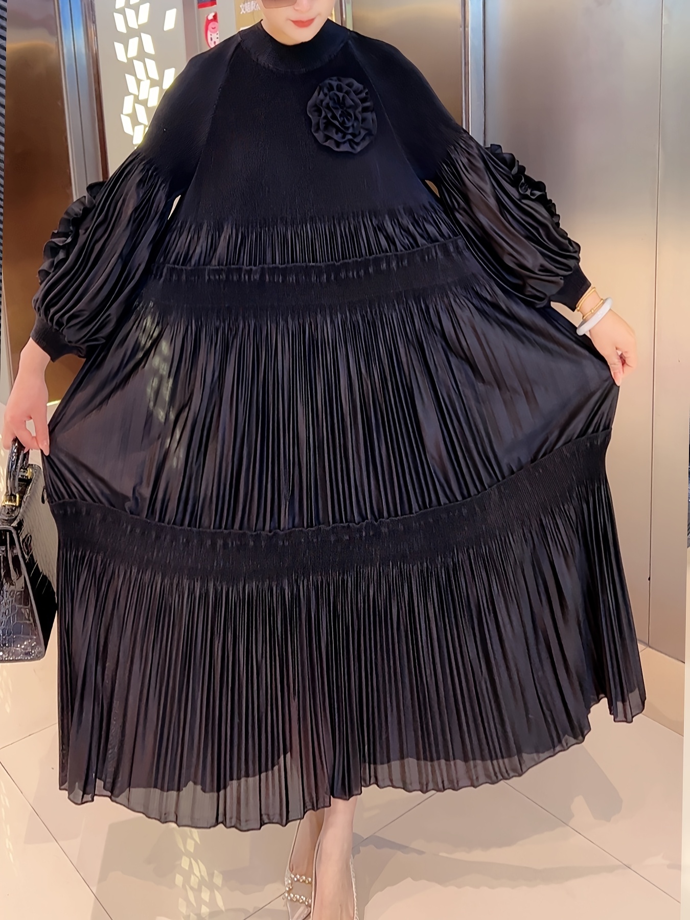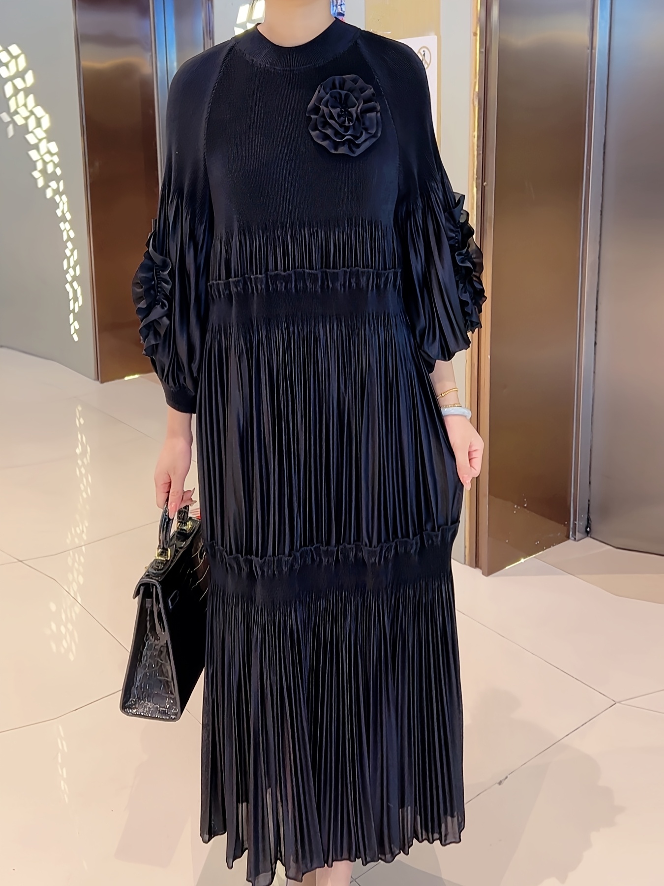 [Polyester|Elegant] Polyester Elegant Pleated Tunic Dress | Crew Neck, High Stretch, Long Length, No Belt, All Seasons | Trapeze Hem, Pleated Silhouette, No Padding, Going Out Occasion, A Fit Type, Woven Weaving Method, Polyester Lining, 100 g/m² Lining Weight, 100 g/m² Fabric Weight, Lantern Sleeves, Solid Color