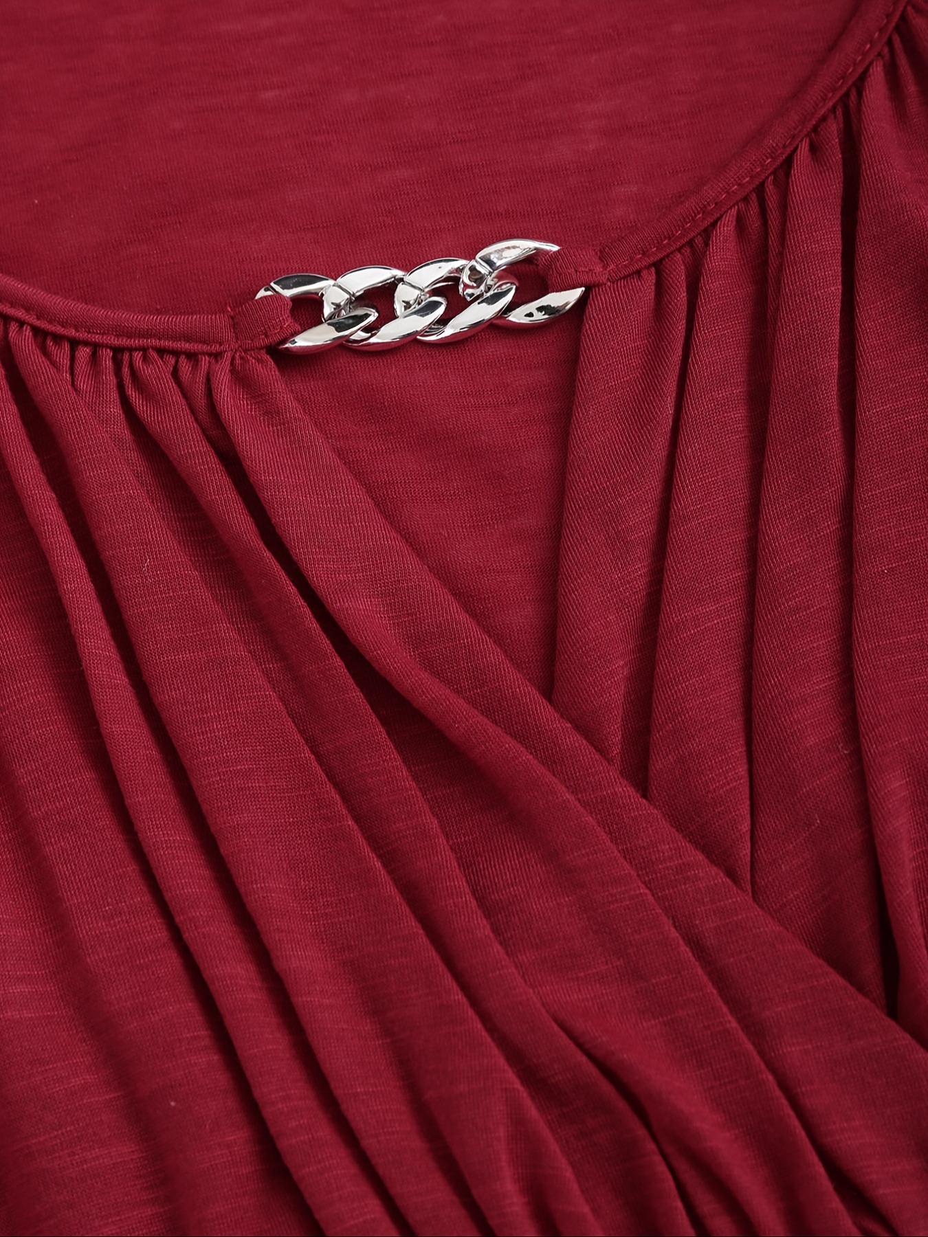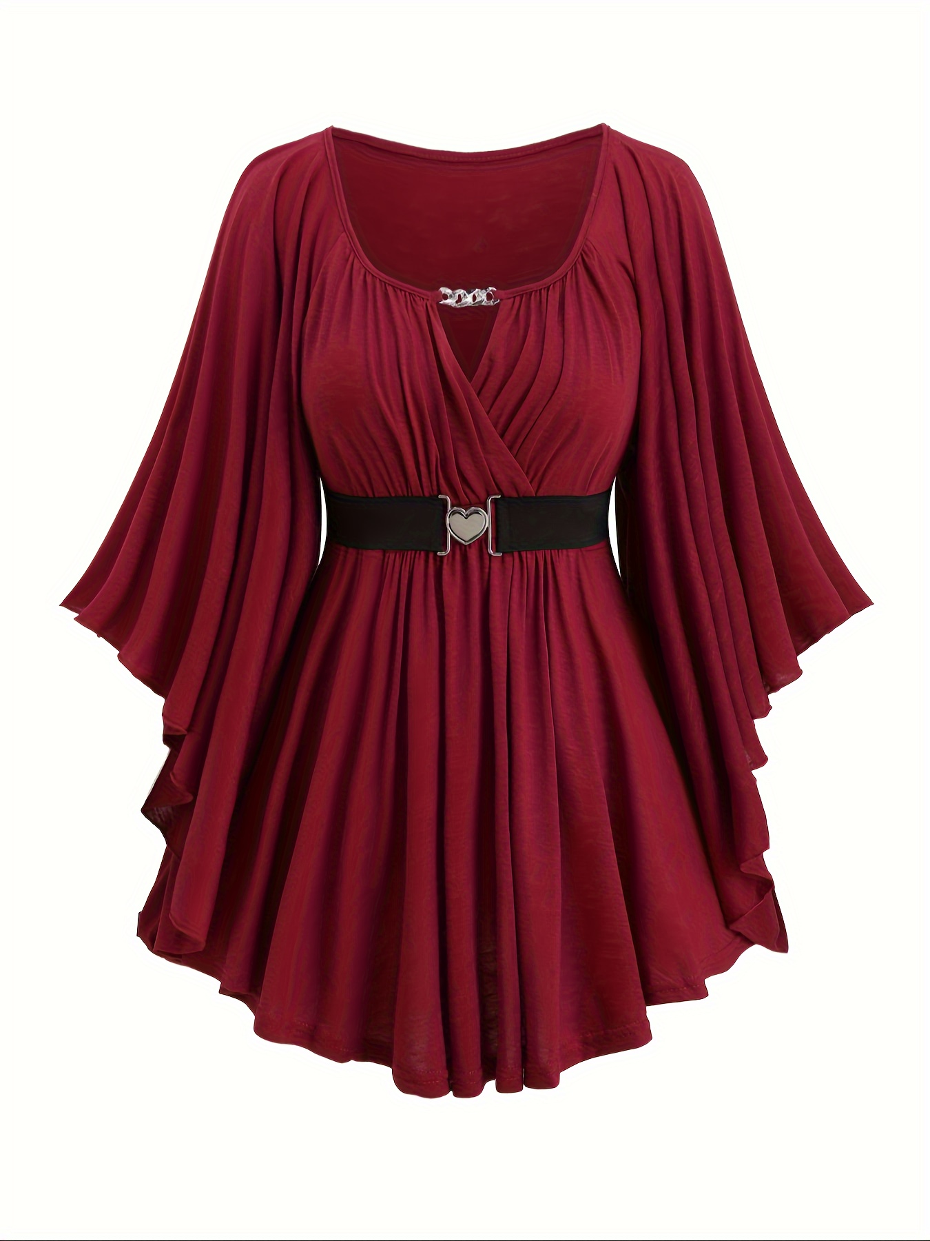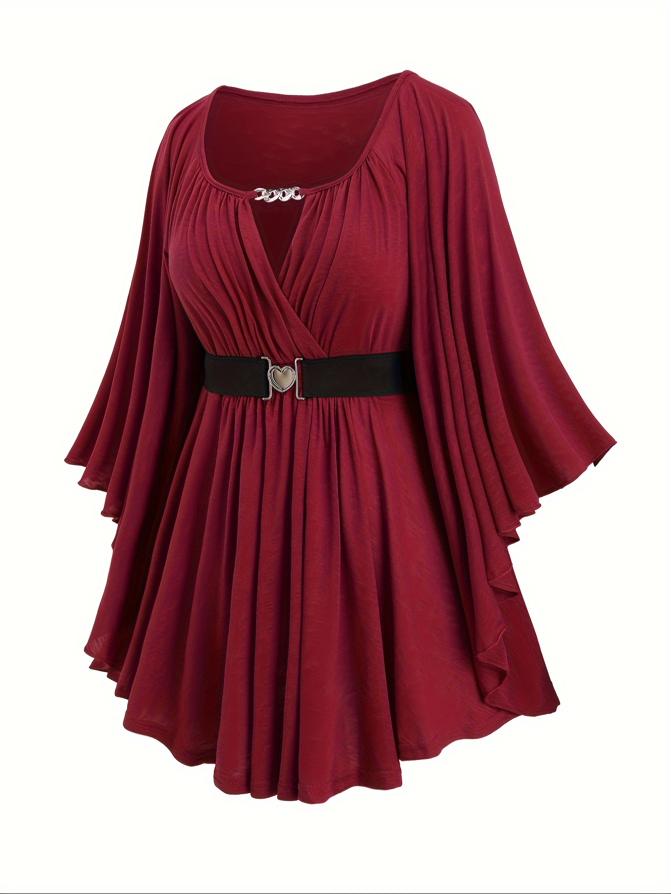 Plus Size Solid Keyhole Neck Belted Top, Ruched Flare Sleeve Chain Decor Elegant Top For Spring & Fall, Women's Plus Size Clothing