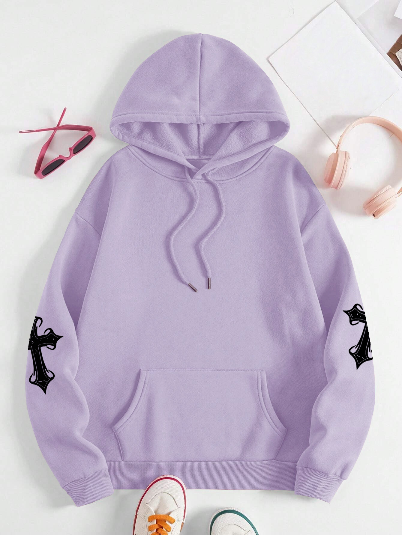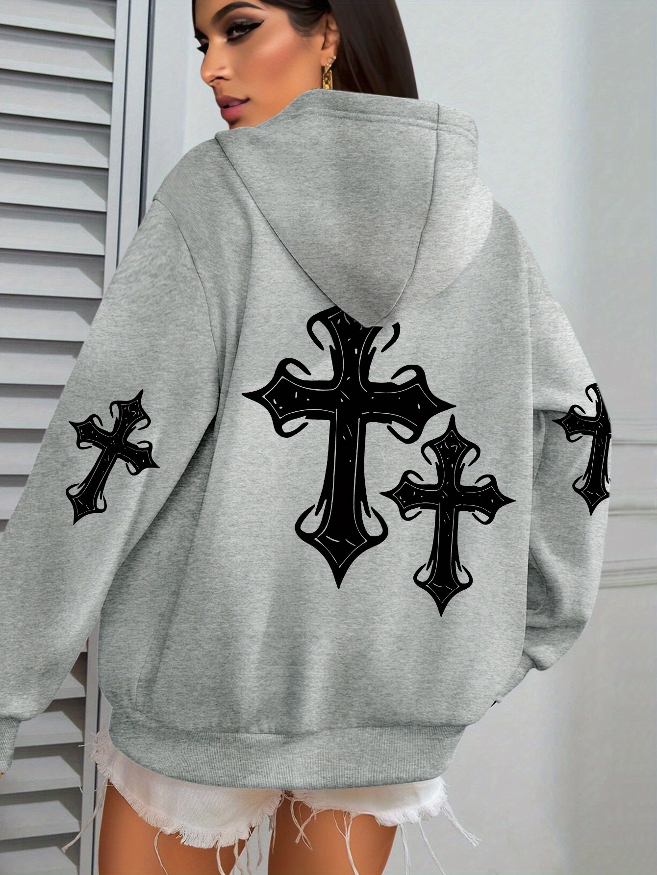 [Faithinspired Plus Size Hoodie] Faithinspired Plus Size Women's Elegant Casual Hooded Sweatshirt - Black Cross Print Long Sleeve Pullover, Cozy Fall & Winter Machine Washable Hoodie, Soft Fabric, Stylish, Durable Construction