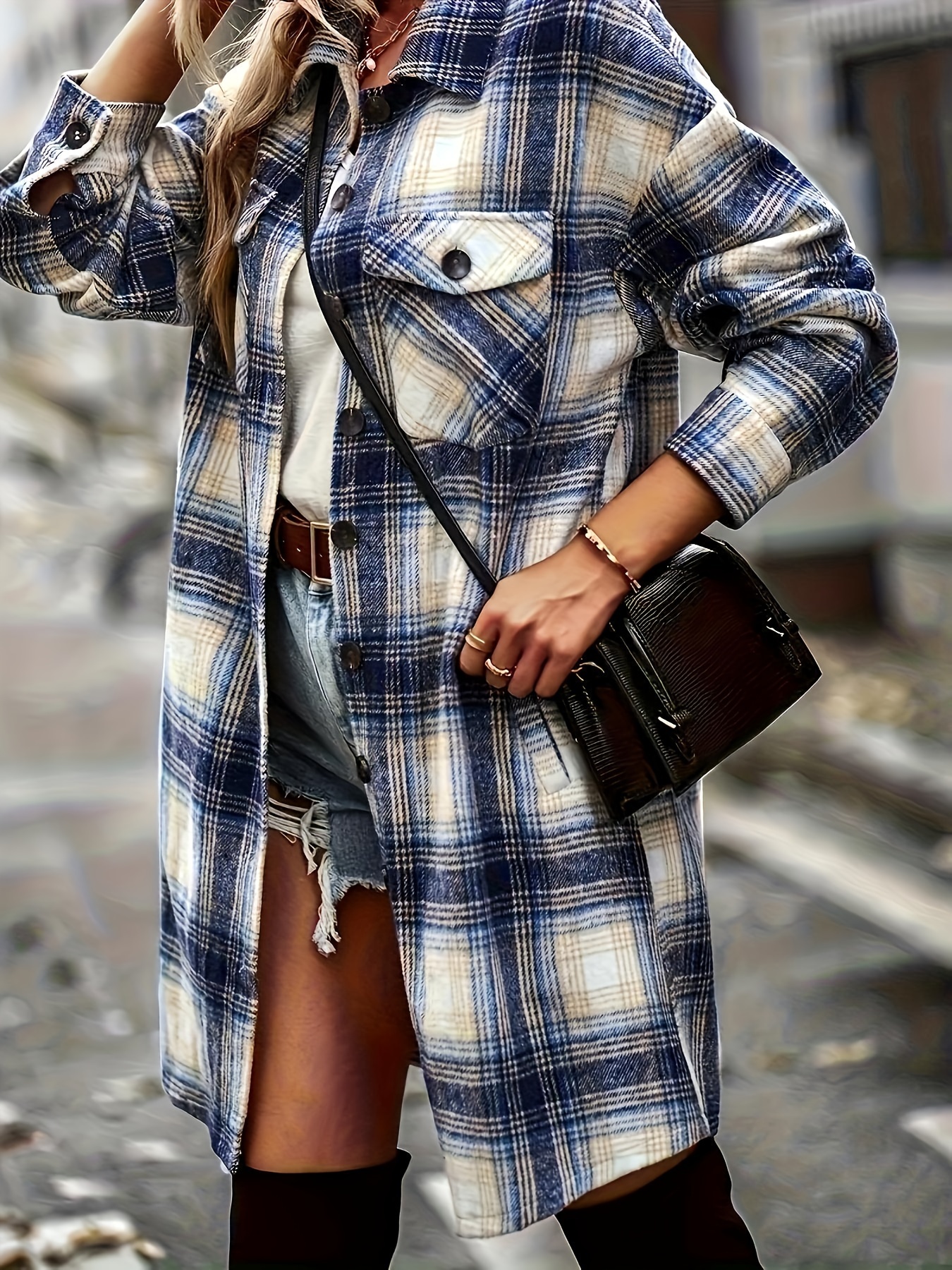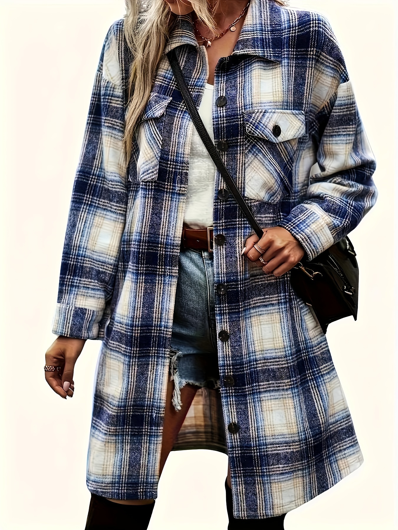 Women's Plus Size Plaid Button-Up Shirt Style Trench Coat, Casual Long Sleeve Open-front Overcoat with Pockets, Vintage-Inspired Polyester Woven All-Season Jacket