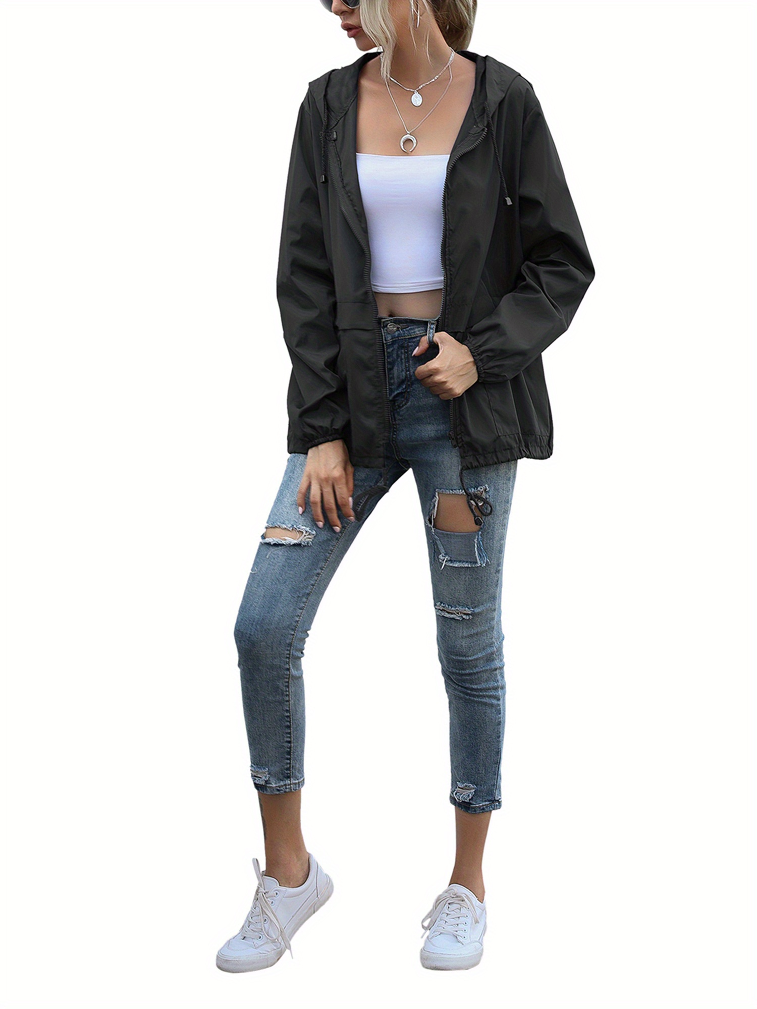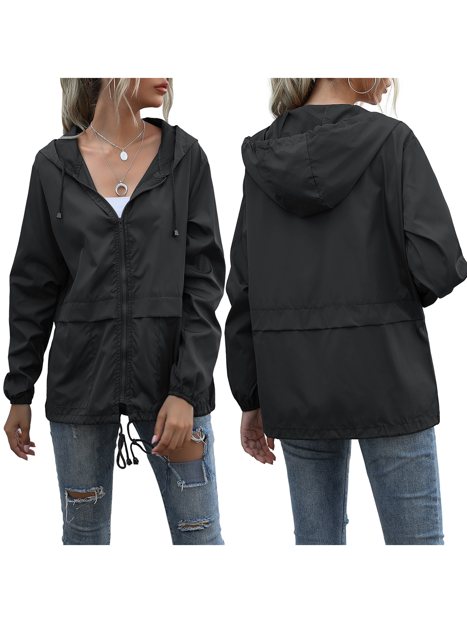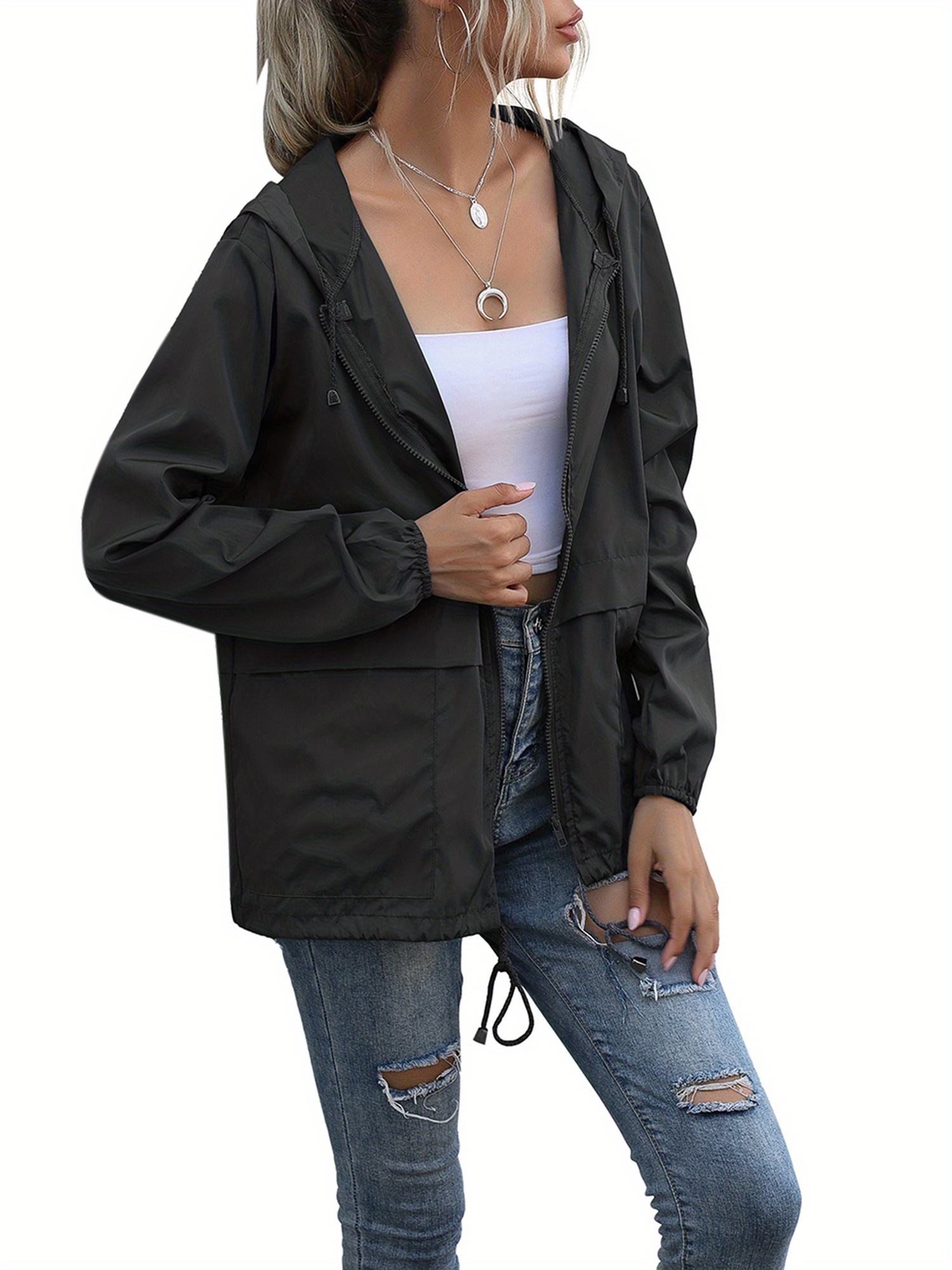 Women's Water-Resistant Hooded Jacket - Solid Color, Zip-Up with Drawstring Detail, Casual Polyester Coat for Spring/Fall, Machine Washable - Sizes L to XXL