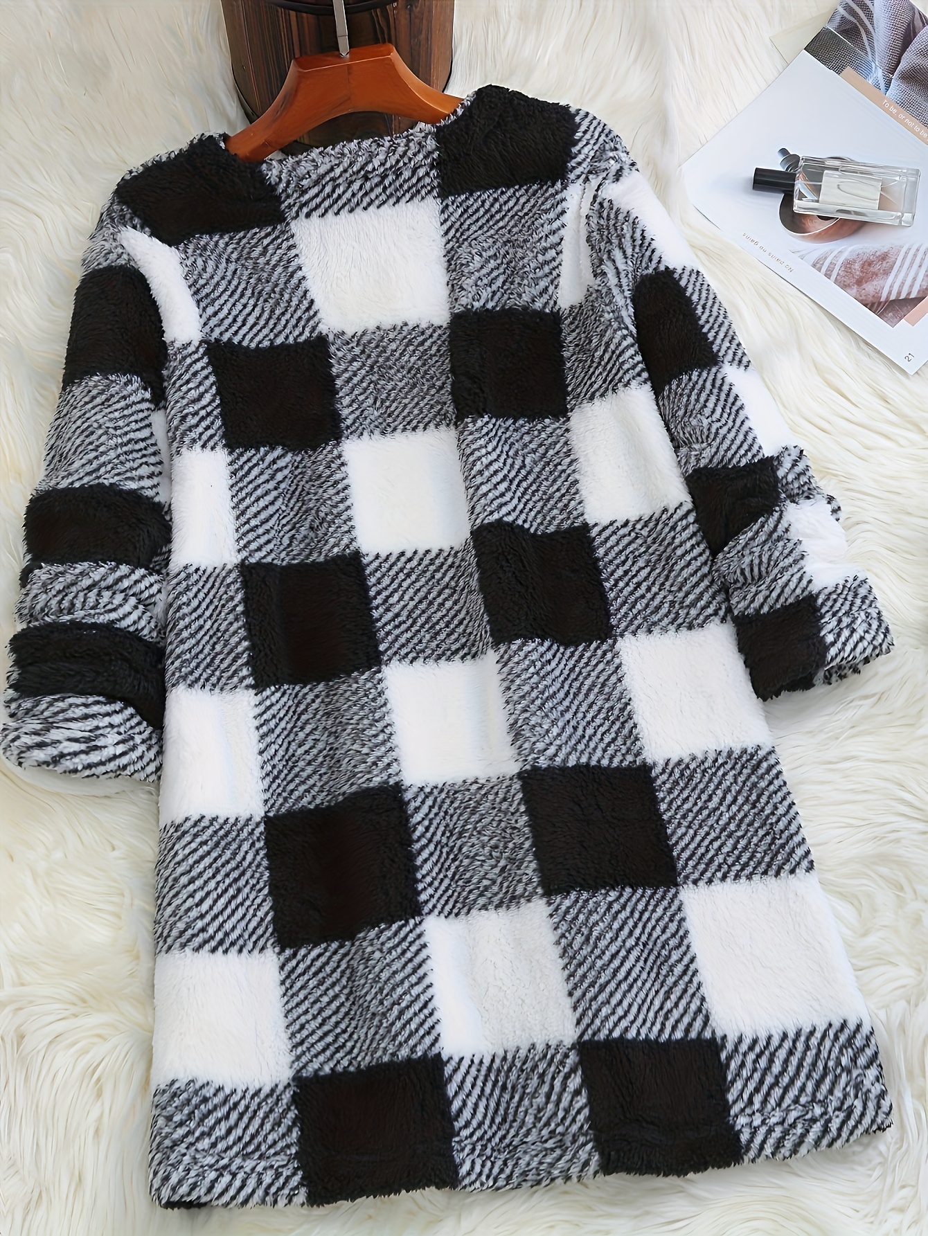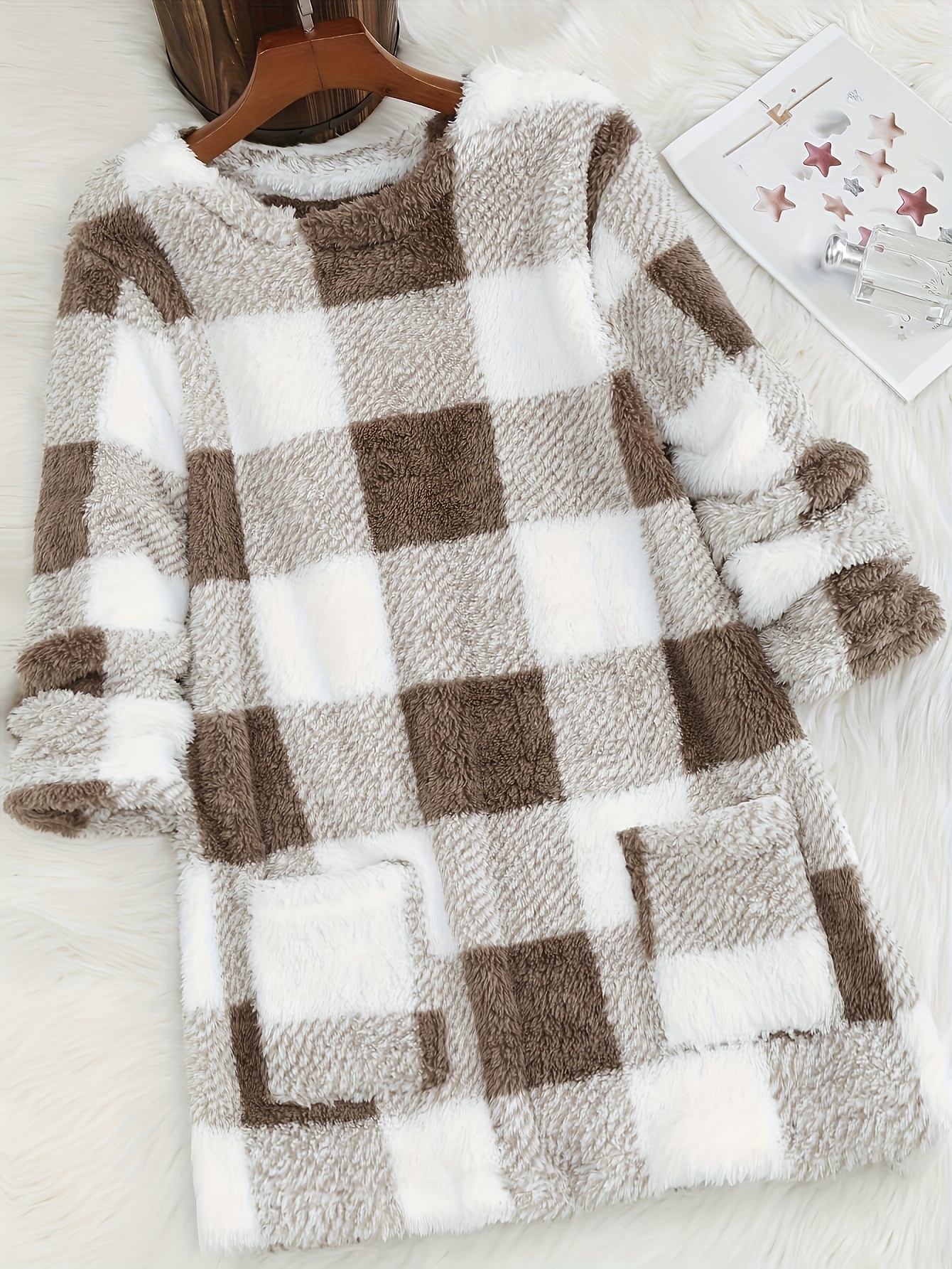 Plus Size - Women'S Plus Size Plaid Sweater - Cozy Fleece-Lined Long Sleeve Round Neck Top with Pockets, Casual Fall/Winter Wear