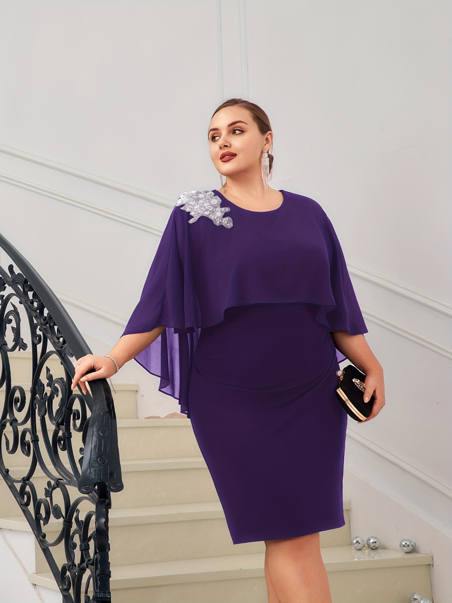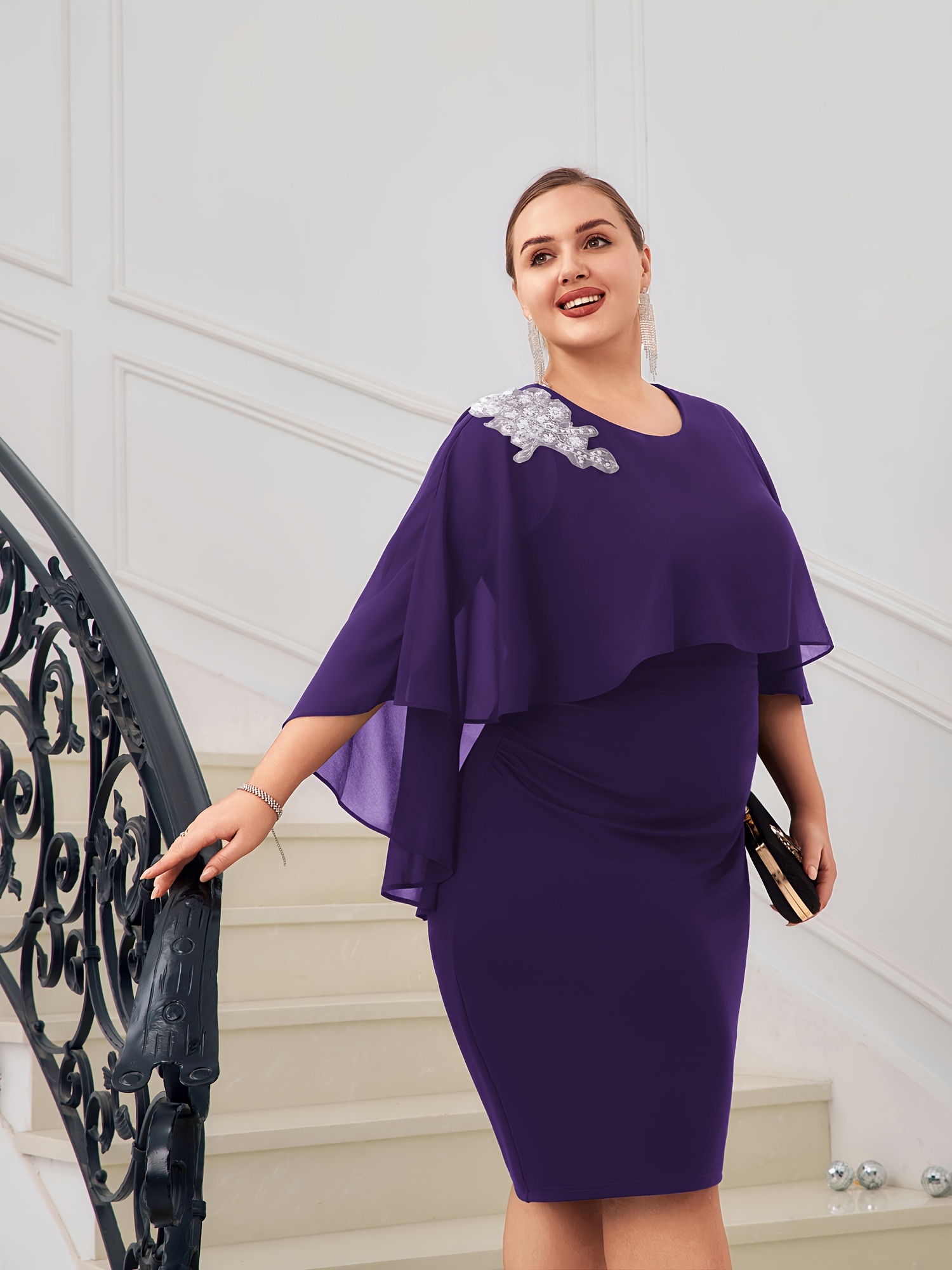Women Plus Size Chiffon Overlay Decorated Party Dress Crew Neck Bodycon Dress